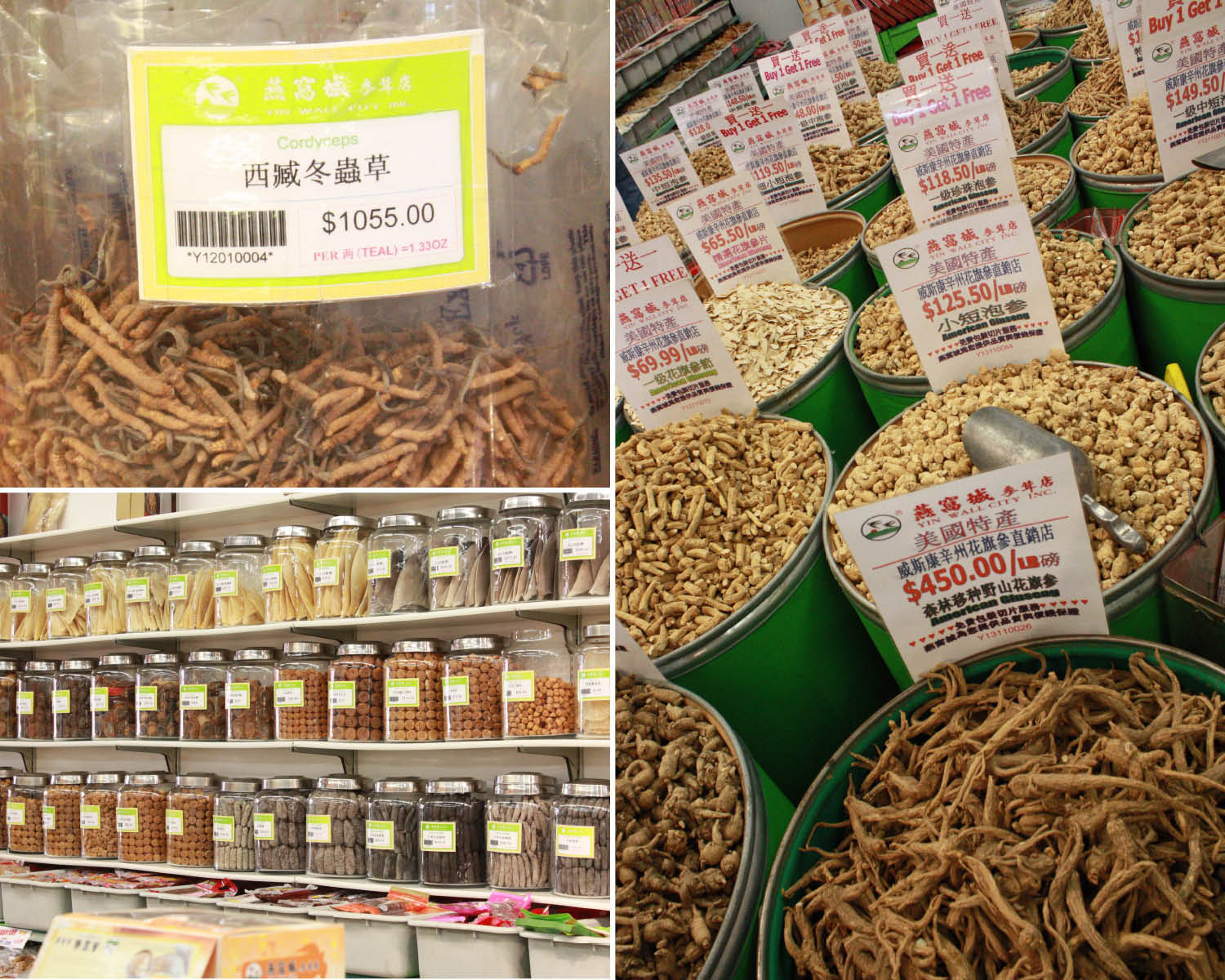 There are several stores devoted to herbal medicine, including one that sells ginko in barrels (above right), and there on the top left, can you read the label on the jar of dirty looking worms? It says: CORDYCEPS: $1055.00 PER TEAL =1.33oz .