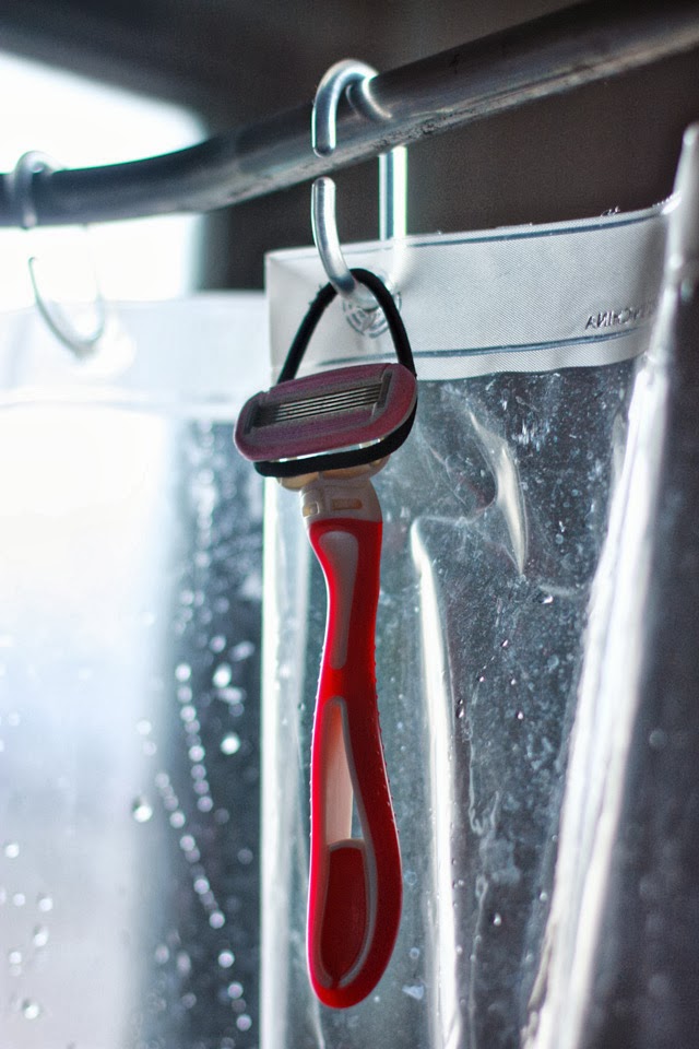 Rubber band + shower curtain ring = instant razor hanging doohicky.