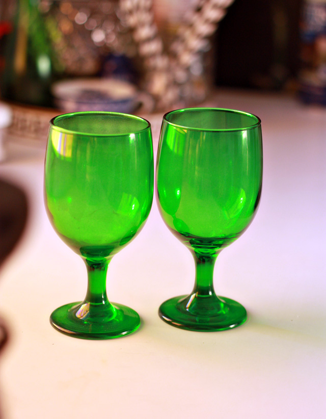 This post already has way too many all caps so you’ll need to imagine this level of mania on the porch that night. What dis I find? Two glasses. Two perfect green goblets exactly lik ethe ones I wanted to steal from the hotel in 2009.