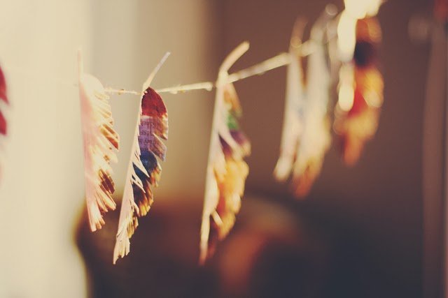 What a lovely update to an already lovely garland! I posted about the original feathers last week but I’ll be sharing this newest turn as well. It’s such an excellent way to use some of those piles of art that parents just can’t bring themselves to throw away when there’s no more room on the fridge 🙂