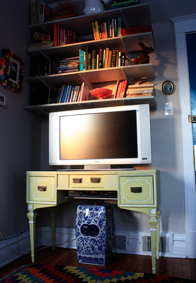 If I was tasteful I’d probably paint the rods black (or bought black rods in the first place), but I’m lazy and white makes for better demo photos. The desk was a thrift store cast-off gift from my friend Grace ten years ago. It used to be cream and red, so I painted it celery and dotted the edges with a gold pen. Up until this fall I had been using it as a vanity in my closet, but then Kiki upgraded TV’s and gave me her old one and I needed a bigger base. It wasn’t until after the TV was already in place that I noticed the pocket underneath would make a great hiding spot for electronics. I know not everyone has a desk or table with sort of structure laying around the house, but let me tell you, there is one at your local thrift store right now.