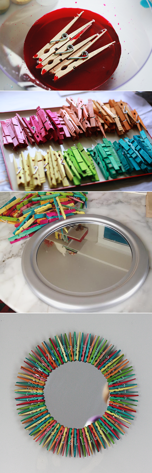 *I laid my clothespins on their side with the tips pointing in. If you laid them flat and alternated their placement, you could turn this from a mirror into a memo board. Holla!