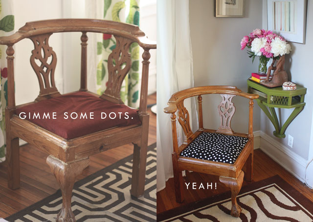 I bought this corner chair at the Salvation Army for $13. It reminds me of one I saw at Monticello so I dubbed it the Jefferson chair. It looks weird but it’s insanely comfortable. It has straight lines and a small footprint like a dining chair, but the arm rests are made in a way that allows for lounging like an arm chair. Plus, this ain’t something you can buy at Home Goods, you know? Initially I thought I would refinish it but when I took it apart I could see that this was not a professional piece but someone’s garage born wood working project. Even better! It’s hella sturdy and I love it as is, wood glue warts and all. Just a light cleaning and linseed oil was all it needed. The cushion though, needed some work. I have a weird fetish for pine and polka dots (don’t ask), so this black and white thing just needed to happen. I am addicted to well-balanced yet non-symmetrical polka dots (again, don’t ask).