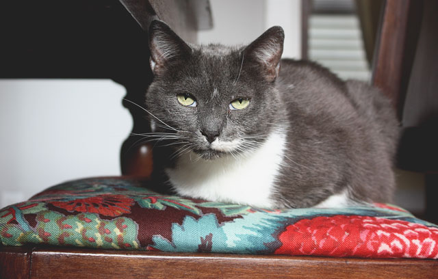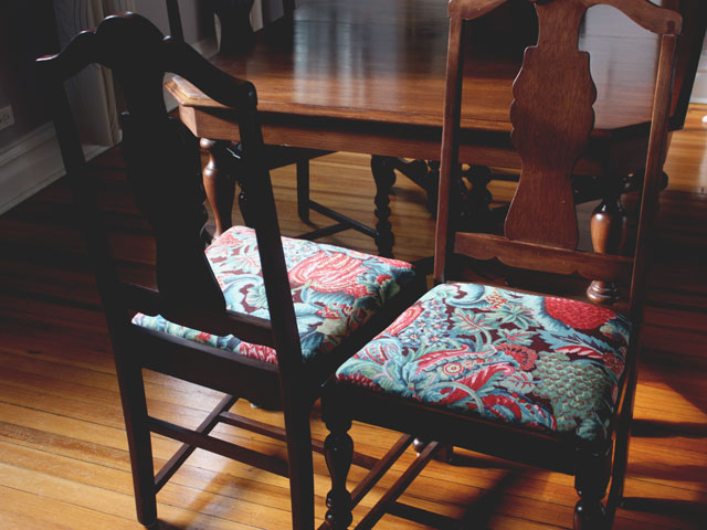My friend Kiki inherited the most gorgeous dining table for her Grandma Lucile (yes, the same Grandma Lucile of Beer Can Alligator fame). The table is the perfect size and shape for her dining room and comfortably seats 8 people without even adding a leaf. The wood is in near-perfect condition but the chairs, oh my, were covered in double laminated pus-colored oil cloth. The bumpy kind. Not cute. Luckily, a year ago, my friend Ann sent me a giant box of fabric, including this gorgeous floral and paisley one. Not only do the colors pick up the wood grain and look great in the room, the fabric is hefty enough to hold up to spot cleaning (if needed) and light weight enough that I could stretch it over the seats nice and tight. Also, and this is most important, Kiki’s kitty Tzeitel looks really good on them.