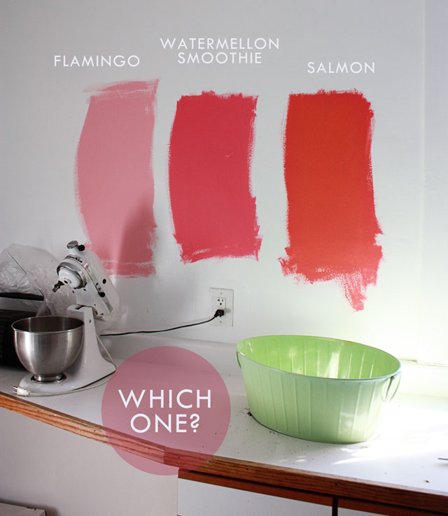 I first chose Flamingo, but I like pink and the name, but then the SALMON color blew me away. I LOVE red and it is so like your couch. If your living room is near your kitchen it would be awesome! So, I am choosing SALMON, which is not like what the others have chosen. What did you do to the cabinets? Paint them or paper them???? Looking forward to the unveiling…..