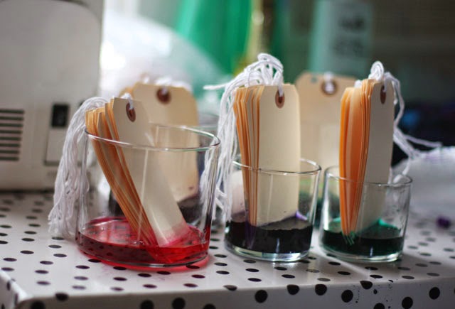 For the base, I just double stick taped a couple of pieces of white foam board, then ran around the edges with some striped washi tape. Dressmaker pins, a gold Sharpie, and desktop easel and whamo: an awesome seating card display for under $10. Not bad.
