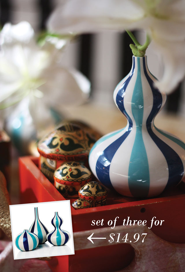 These happy, blue striped bud vases came home with me a while ago and I can’t tell you how they make me smile. Most of Jonathan Adler’s pottery is way out of my price range, so I felt particularily proud of myself for scoring such a bargain….but now, whoa, the price was slashed even further! Think I’ll pick up a few more in gold and split them up as holiday gifts.