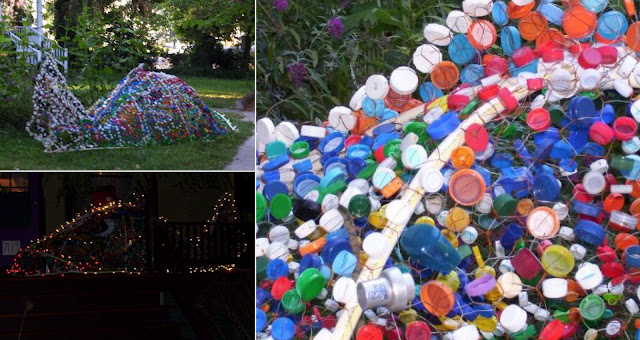 This is the new face of lawn ornamentation: a Toyota sized chicken wire topiary fish covered in recycled bottle caps.