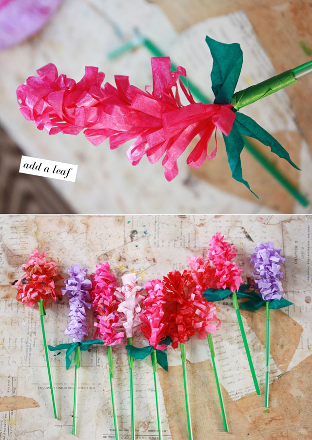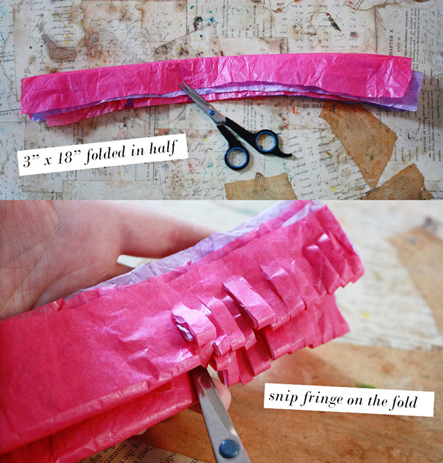 Also, as you may have noticed above, my tissue paper has a big stain on it –the result of a simple water spill (all the colors in the stack ran together)…it gives some of the flowers a two tone effect that I think is pretty neat. But you could skip that. Or just spill water on a stack of colors and get them to run on purpose for a mottled/watercolor effect. That might be cool, no?